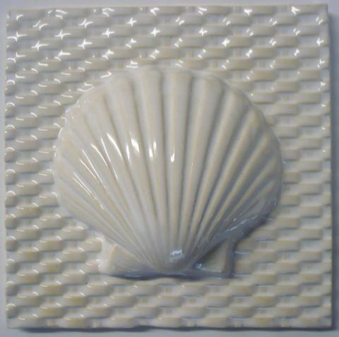 This is a deep bas-relief scallop tile with a woven background. It is shown here in soft white, and is also available in tiffany turquoise, natural, antique crackle, royal blue, fog gray, and may custom colors. It is often used as part of a fireplace surround, an element in a kitchen backsplash, or an aspect of a panel on the back wall of a shower.